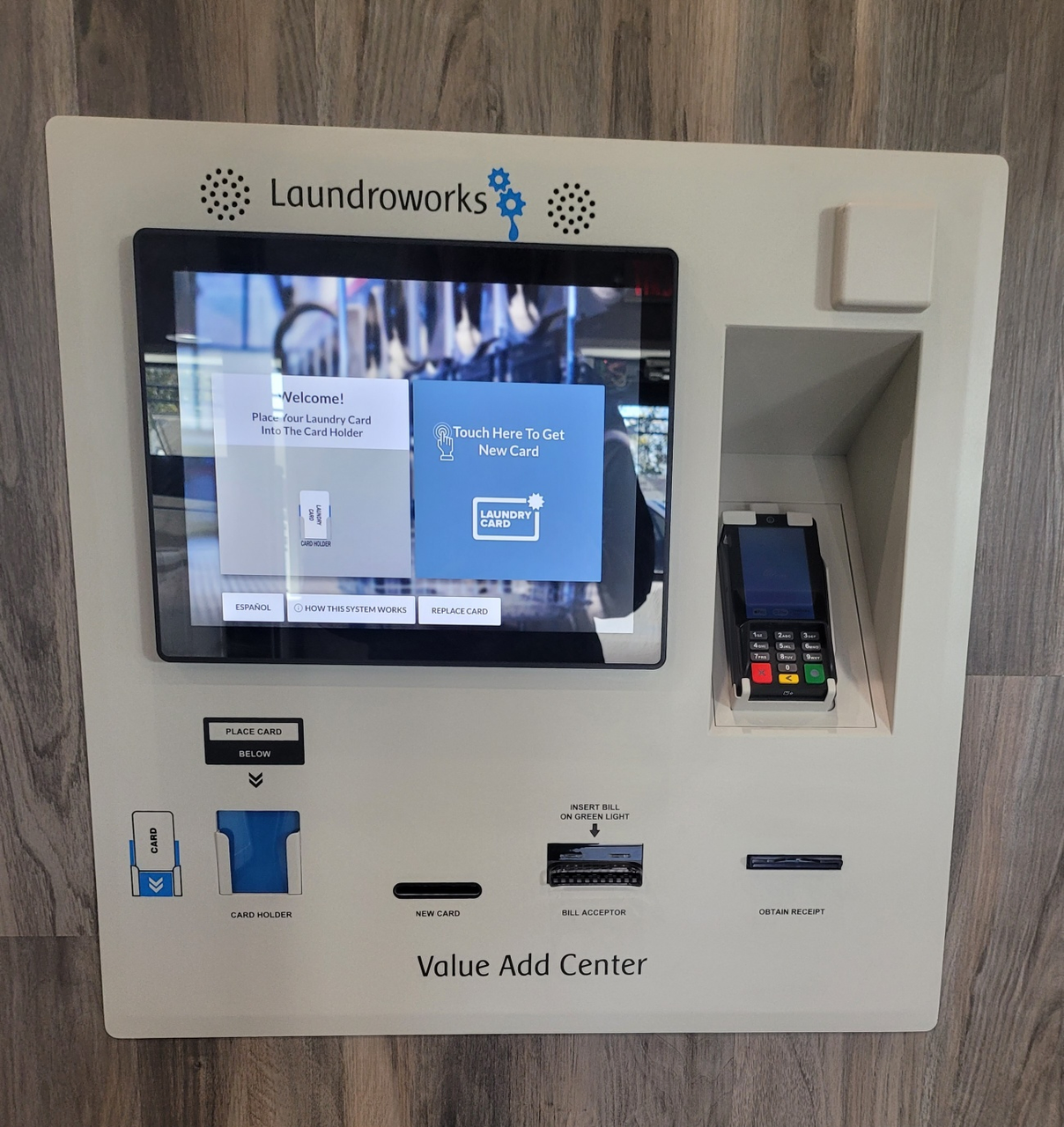 "Laundroworks" Laundry Card reader accepts: Cash, American Express, Discover, Mastercard, Visa, Apple & Google Pay